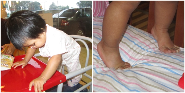 Paling mencabar bila duduk dalam babychair. Aiyaaaa memang tak senang duduk la papa mama ni. Bagi toys pon campak ke bawah. Yang teruja nak berdiri dan panjat naik ke meja. Sungguhlah suka mengexplore. Bila berdiri, nak capai sesuatu siap menjengket... geraaaammmm rasa nak gigit je betis tu!